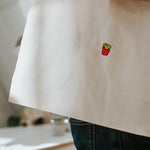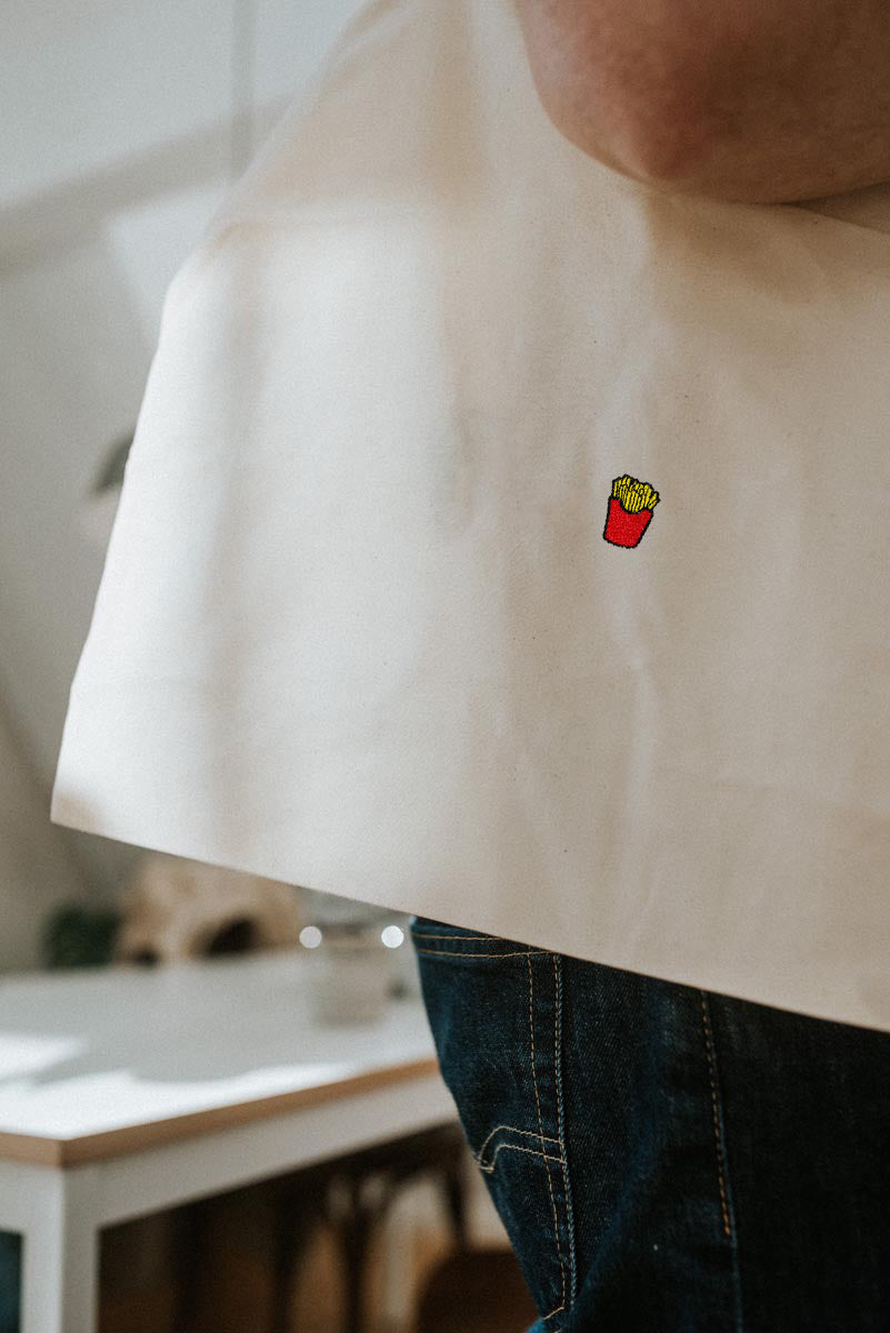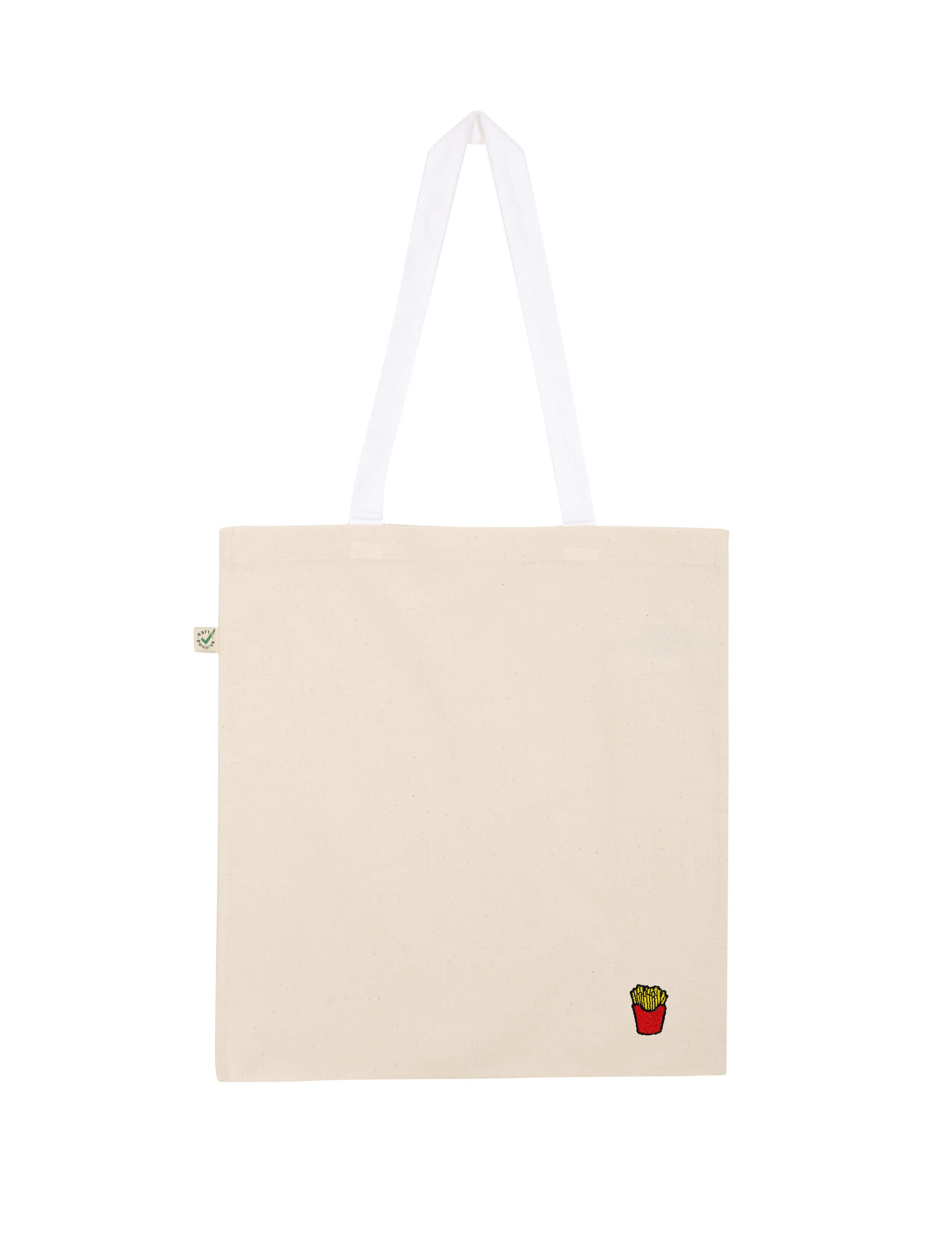 Bestickte, fair produzierte Bio-Baumwoll-Tragetasche im Pommes Design.