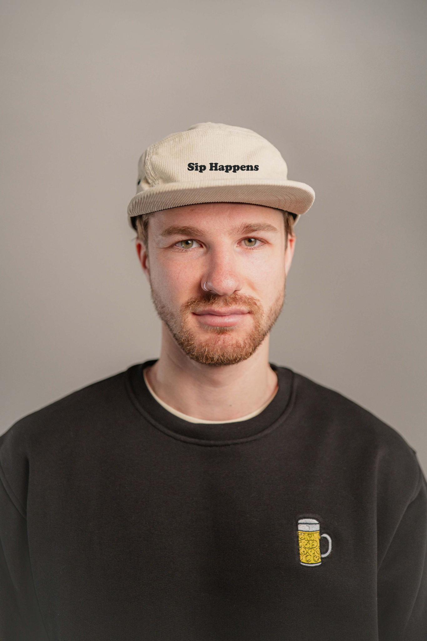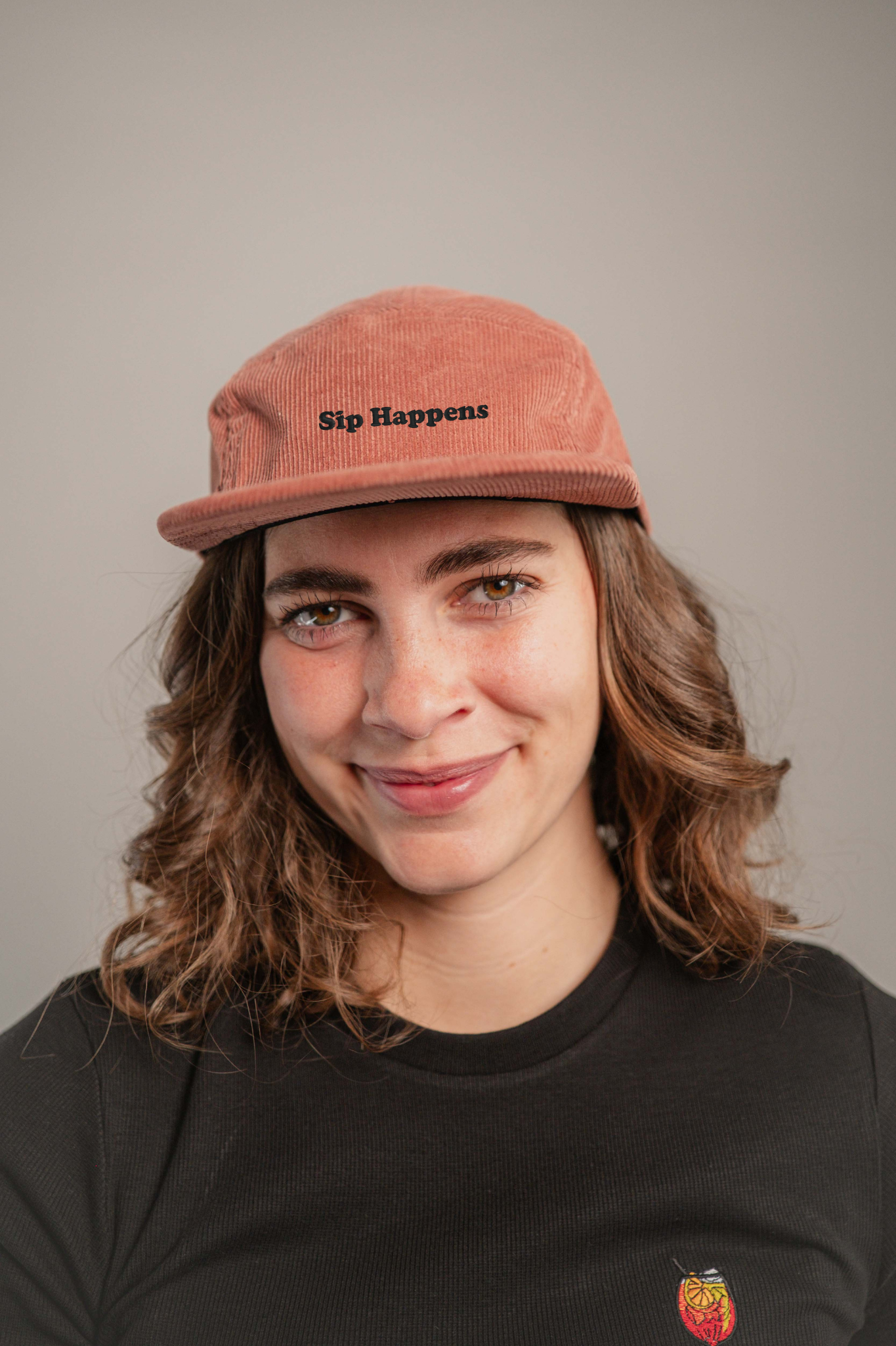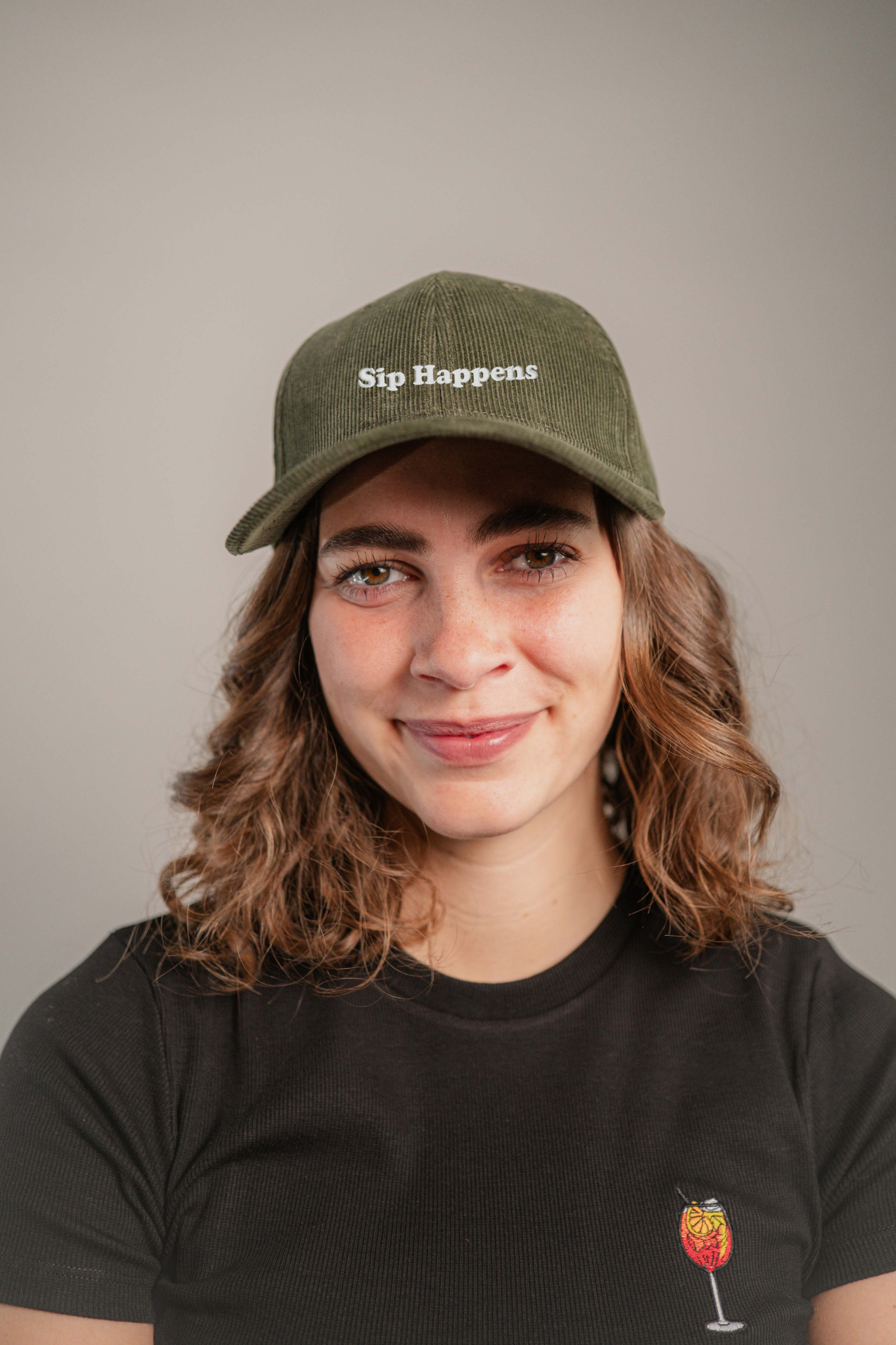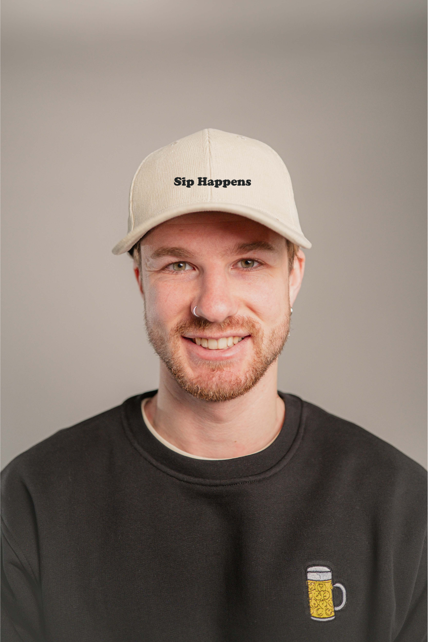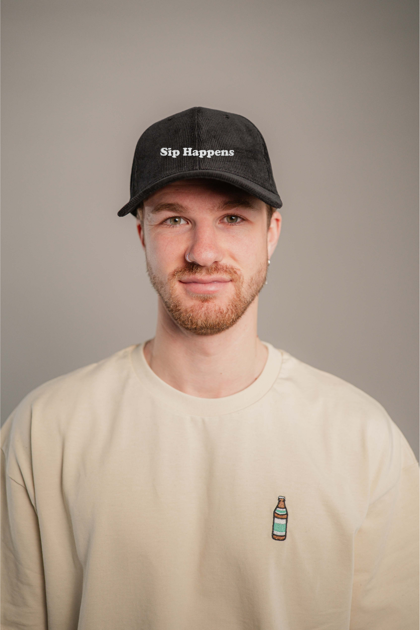Super hochwertige Cord Cap aus 100% Bio Baumwolle mit gestickten "Sip Happens" Schriftzug vorne und kleinem gesticktem Shitemoji seitlich