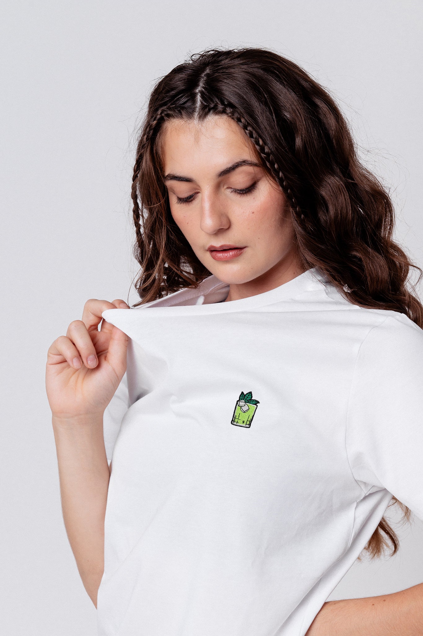 Besticktes Bio Baumwoll Unisex T-Shirt mit schwerem Stoff (190gsm) und gesticktem Gin Basil Smash Design