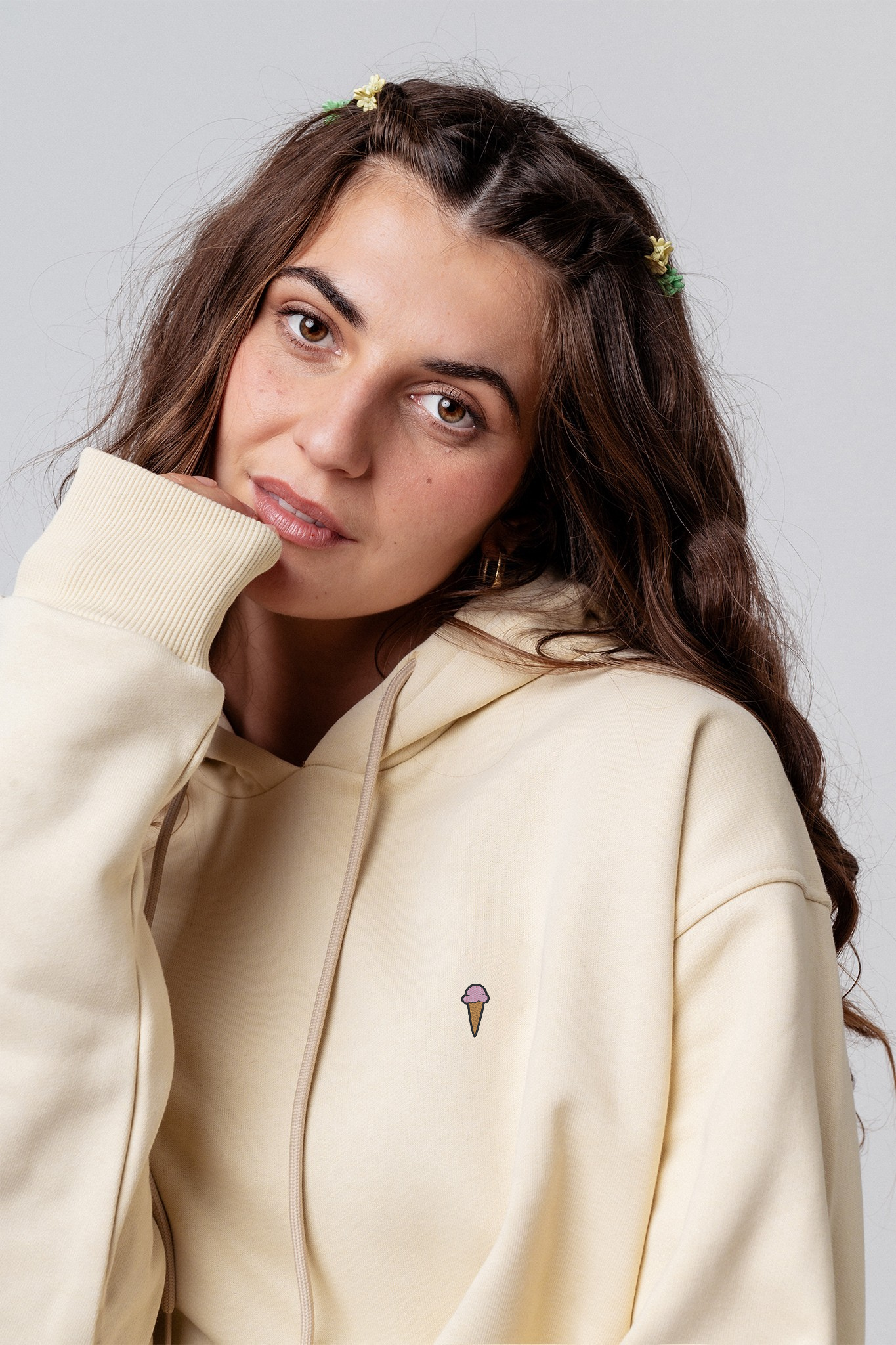 Bestickter Bio Baumwoll Unisex Hoodie mit schwerem Stoff (350gsm) und gesticktem Eis Design - wähle deine Lieblingssorte: Schoki, Erdbeere oder Vanille 🍦
