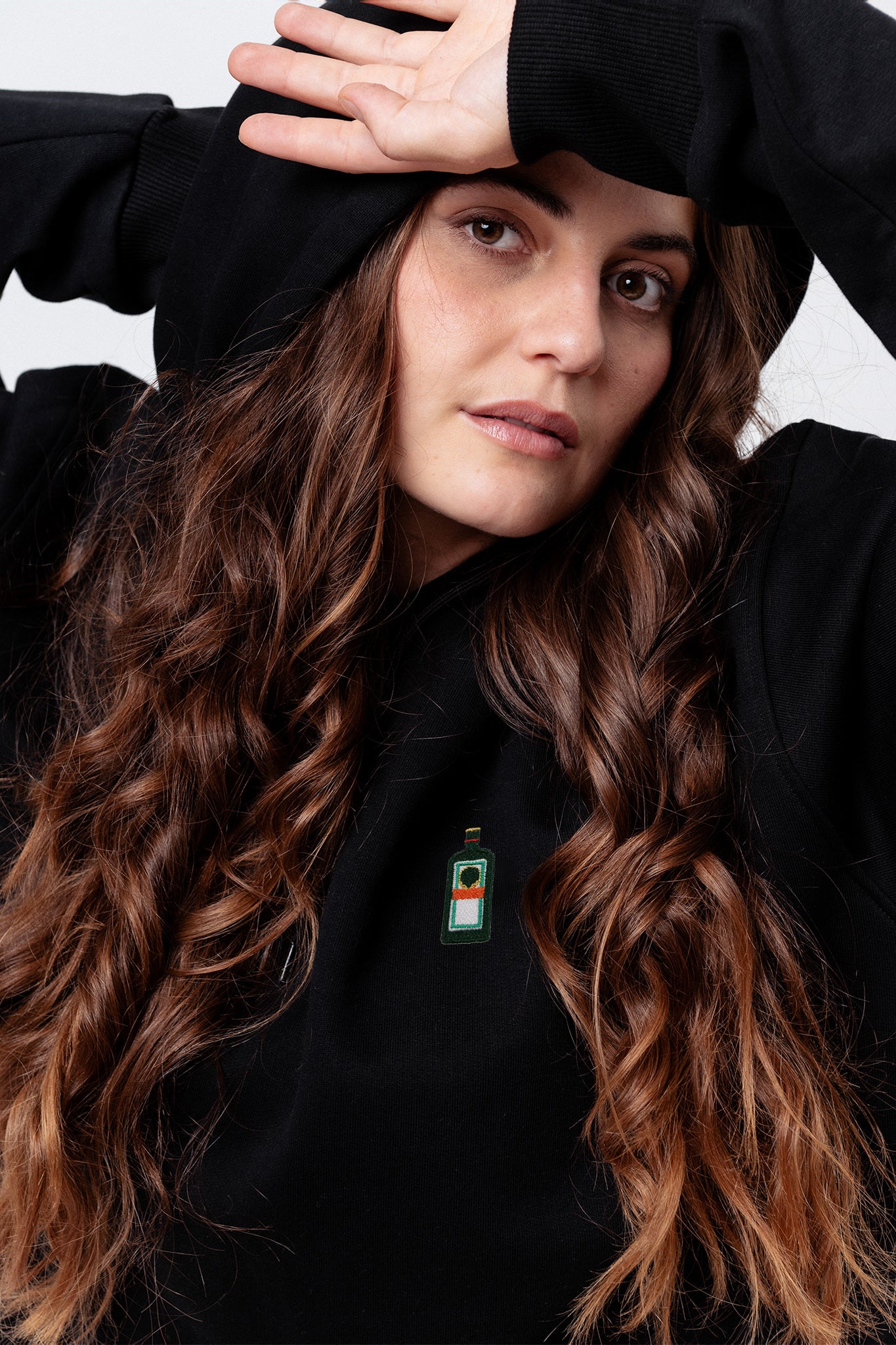 Super hochwertiger Bio Baumwoll Unisex Hoodie mit schwerem Stoff (350gsm) und der offiziellen gestickten Jägermeister Flasche