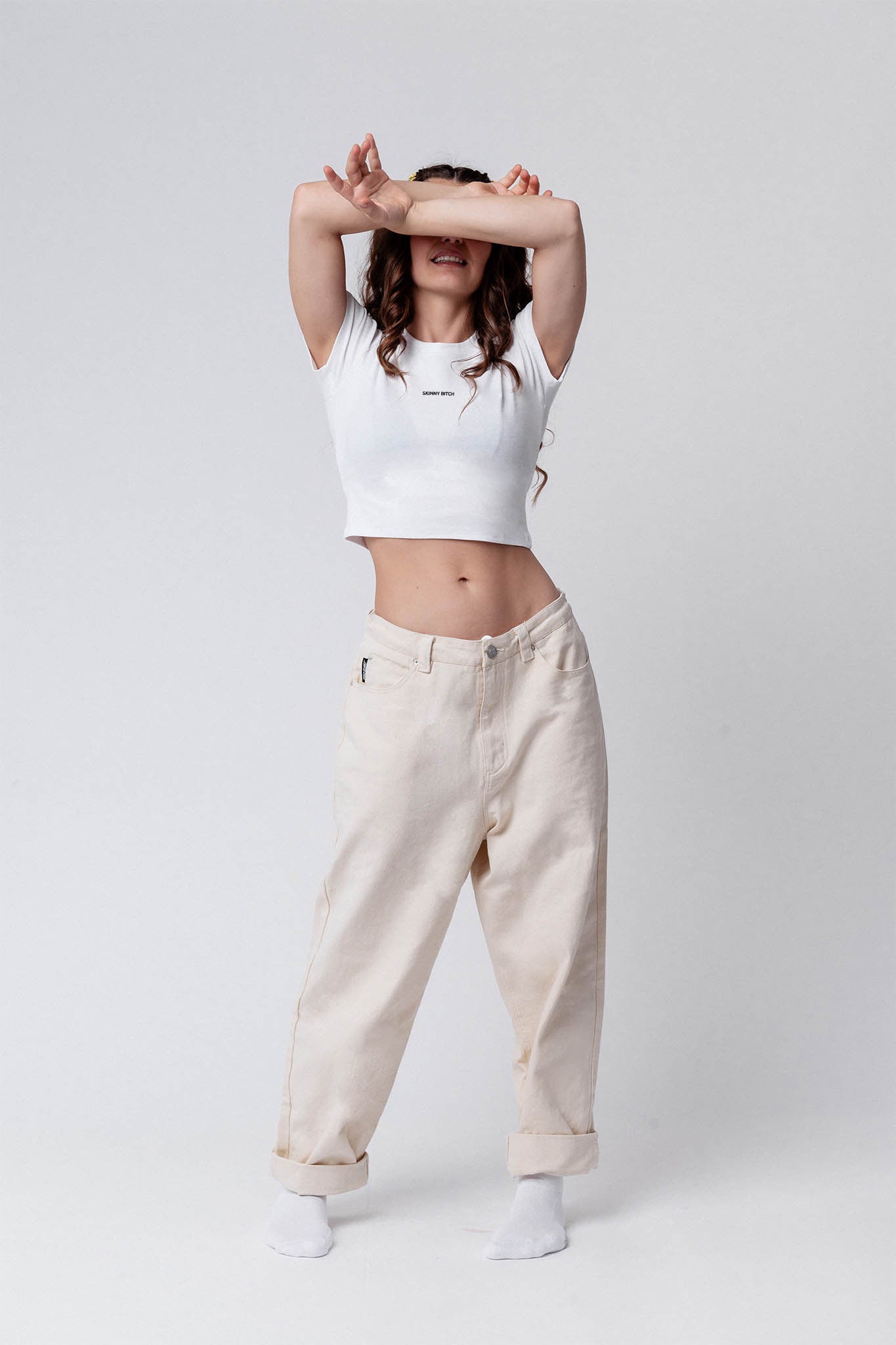 Super hochwertiges Bio Baumwoll Cropped T-Shirt mit gesticktem Skinny Bitch Schriftzug in drei verschiedenen Schnitt-Varianten: Ripped, Regular & Oversized