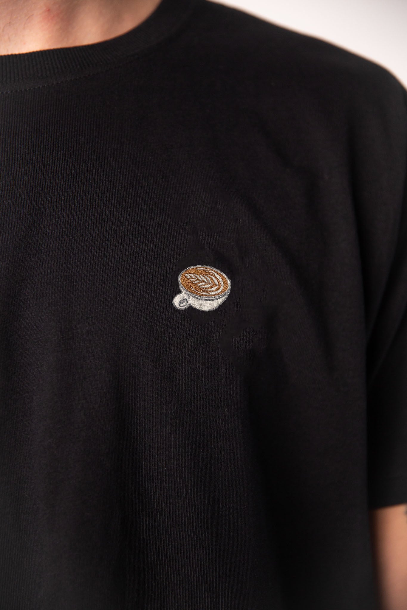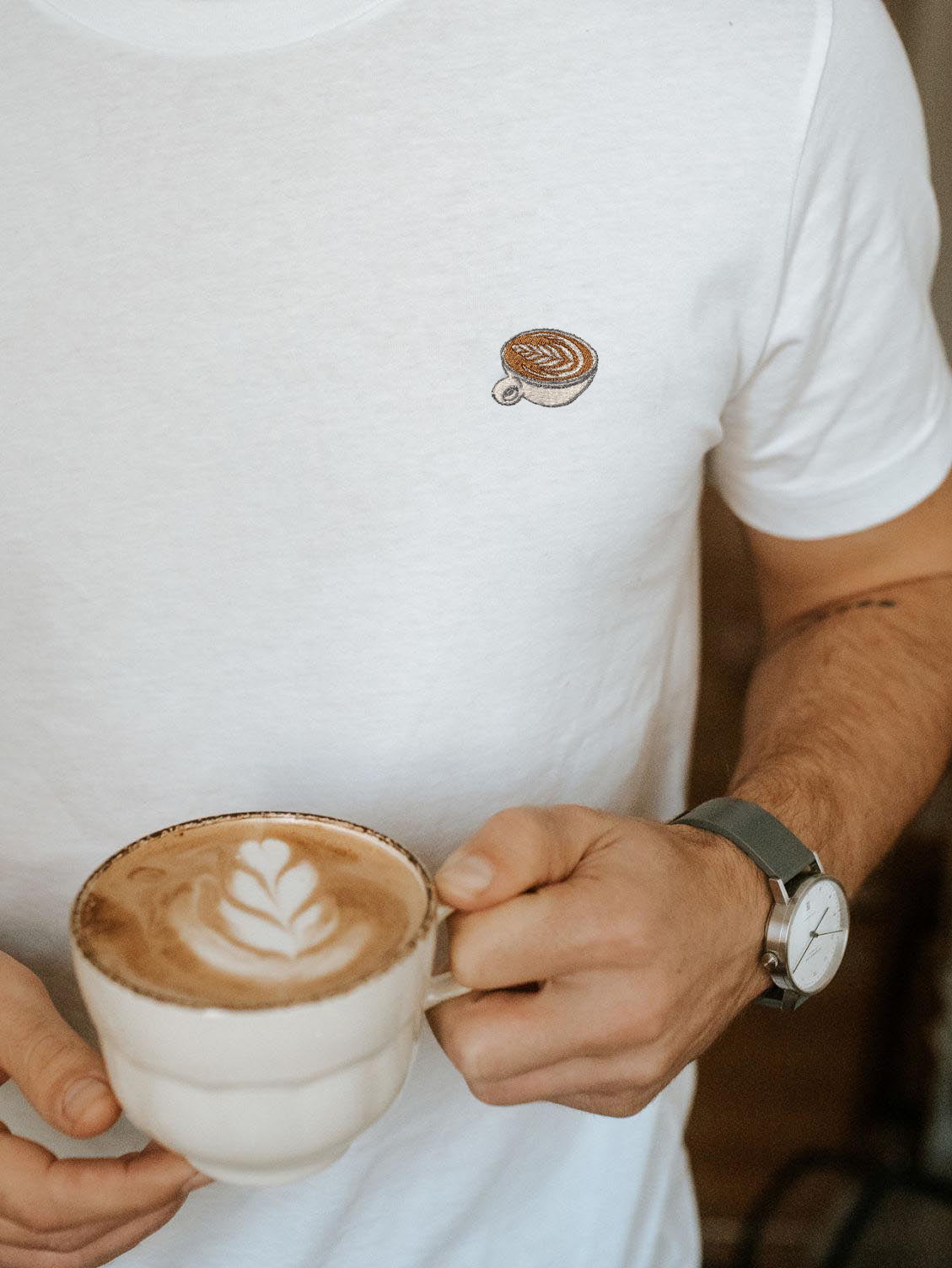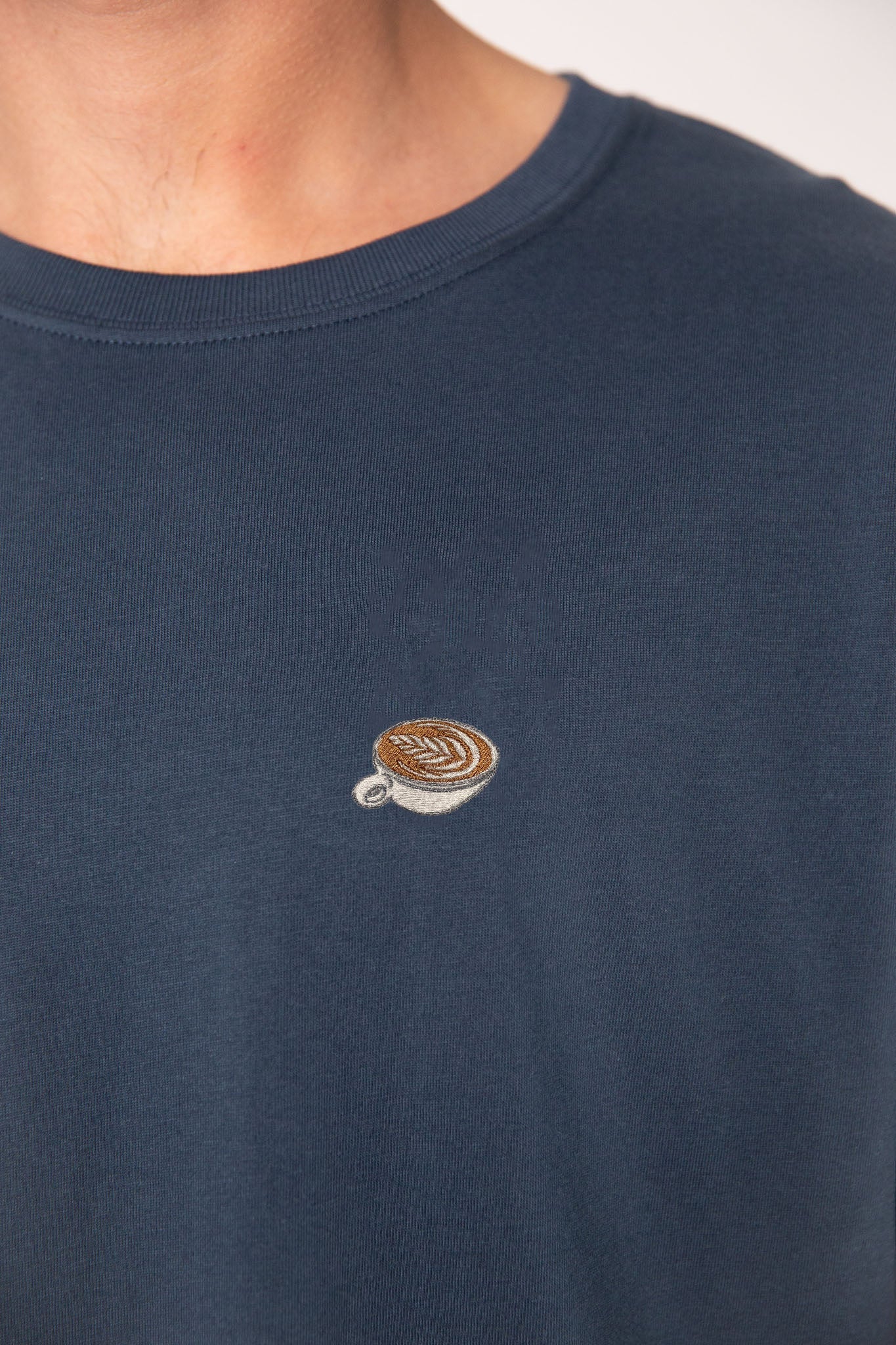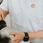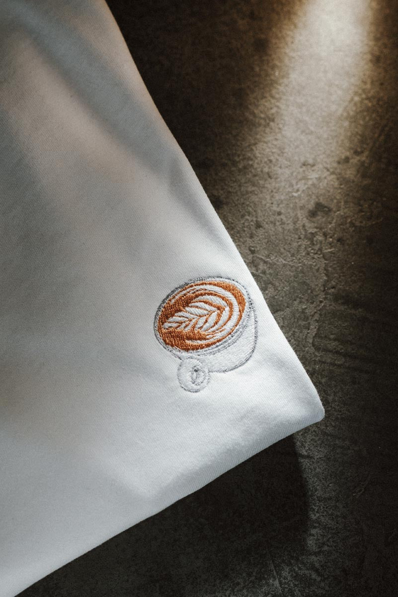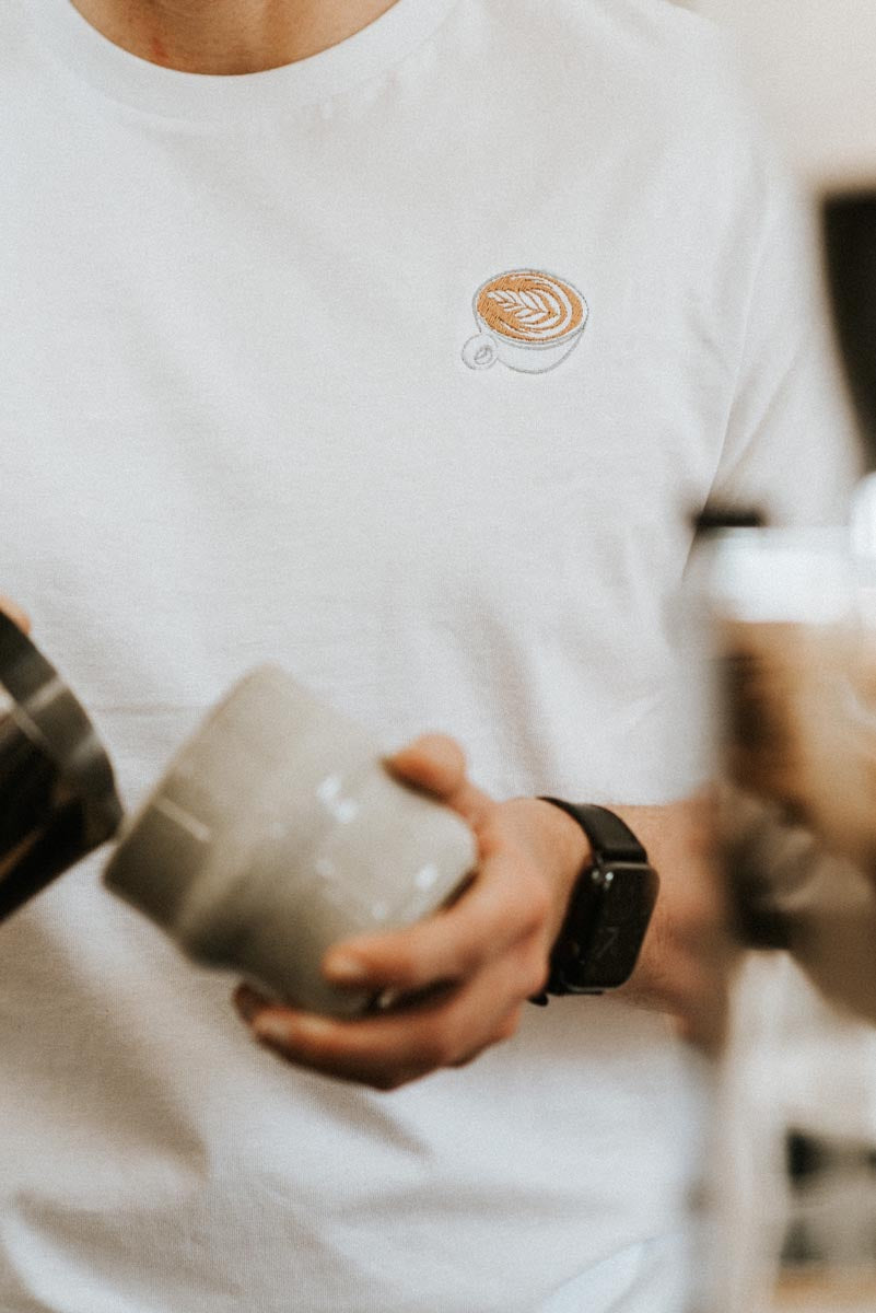 Super hochwertiges Bio Baumwoll Unisex T-Shirt mit schwerem Stoff (190gsm) und gesticktem Flat White Design
