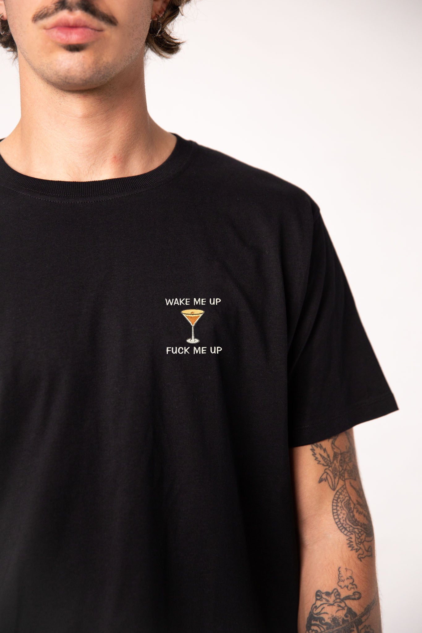 Super hochwertiges Bio Baumwoll Männer T-Shirt mit schwerem Stoff (190gsm) und gesticktem TAILORED TASTES Espresso Martini Design