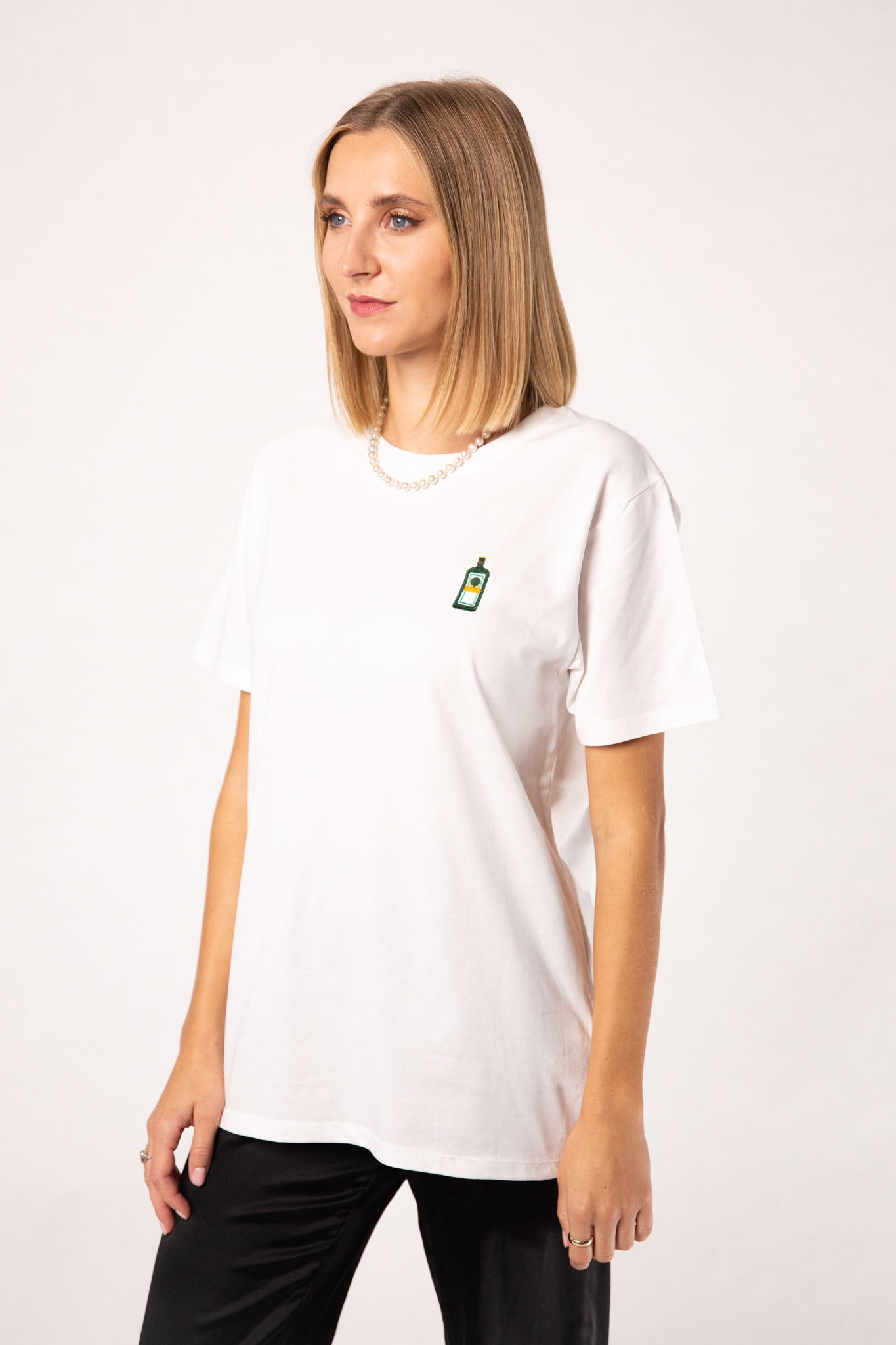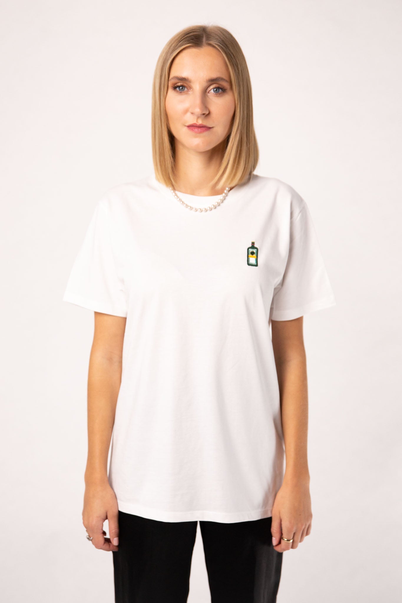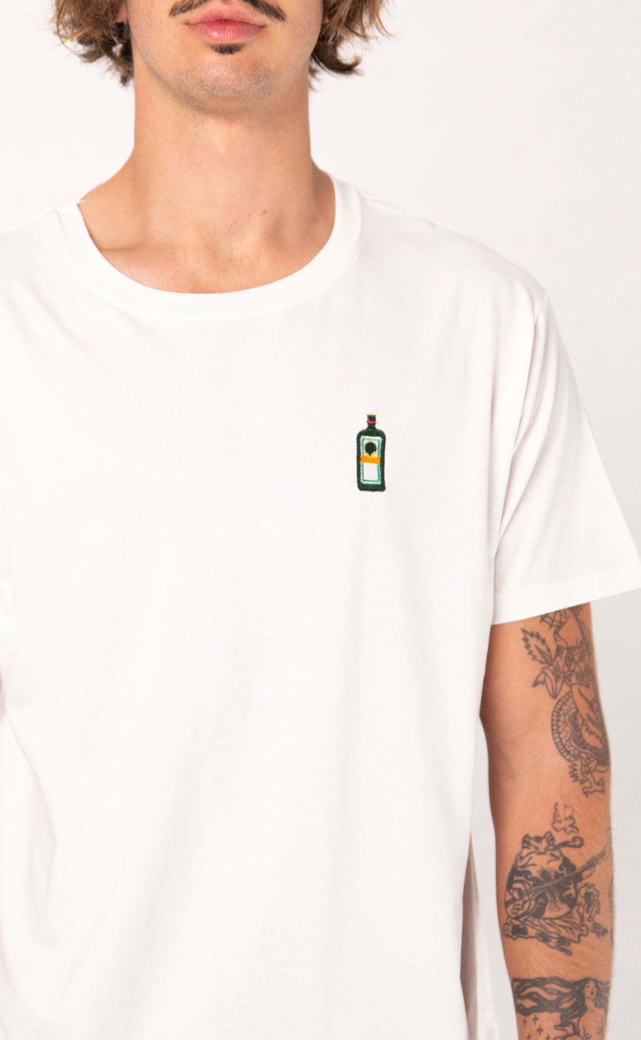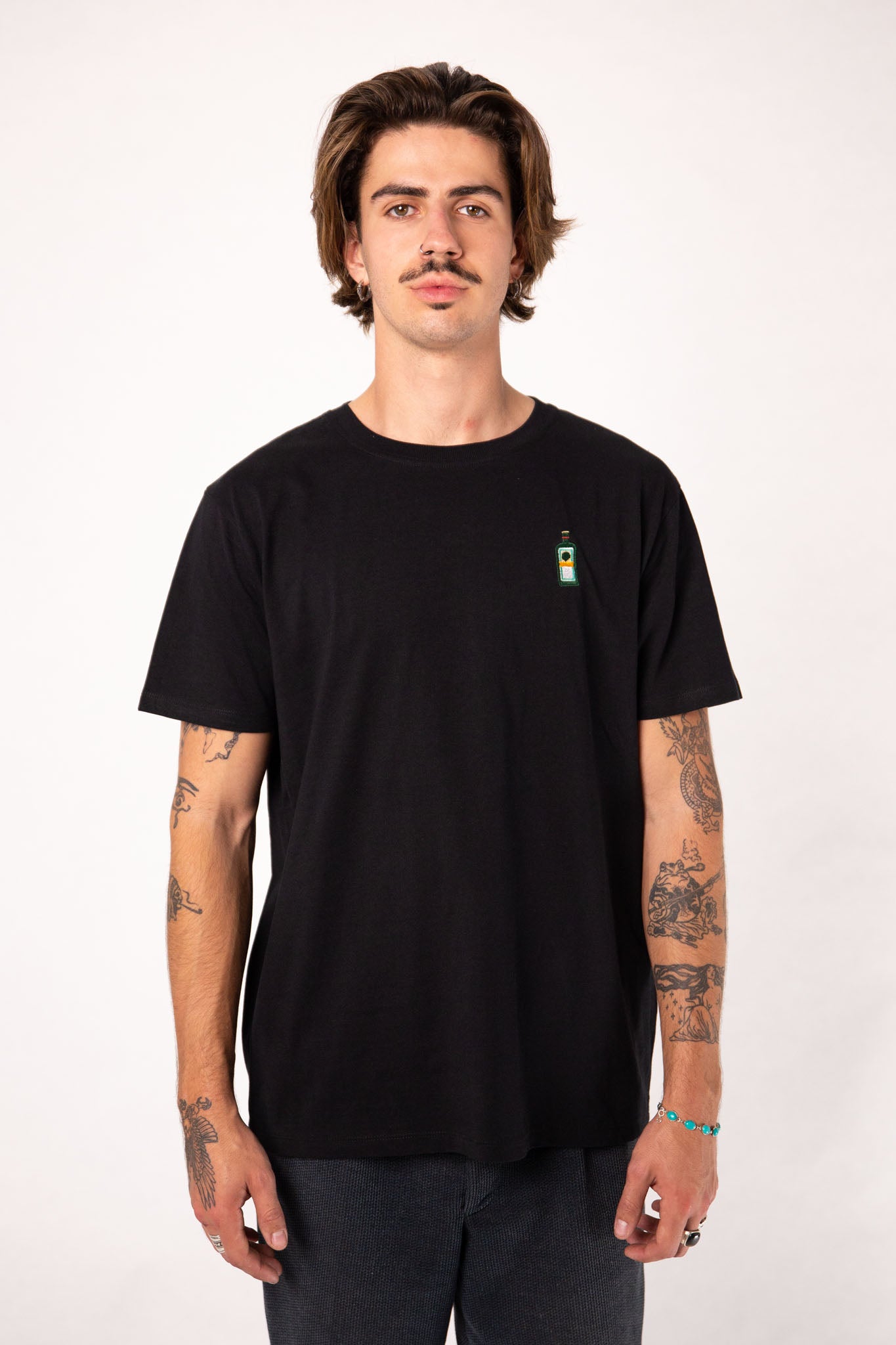 Super hochwertiges Bio Baumwoll Unisex T-Shirt mit schwerem Stoff (190gsm) und der offiziellen gestickten Jägermeister Flasche