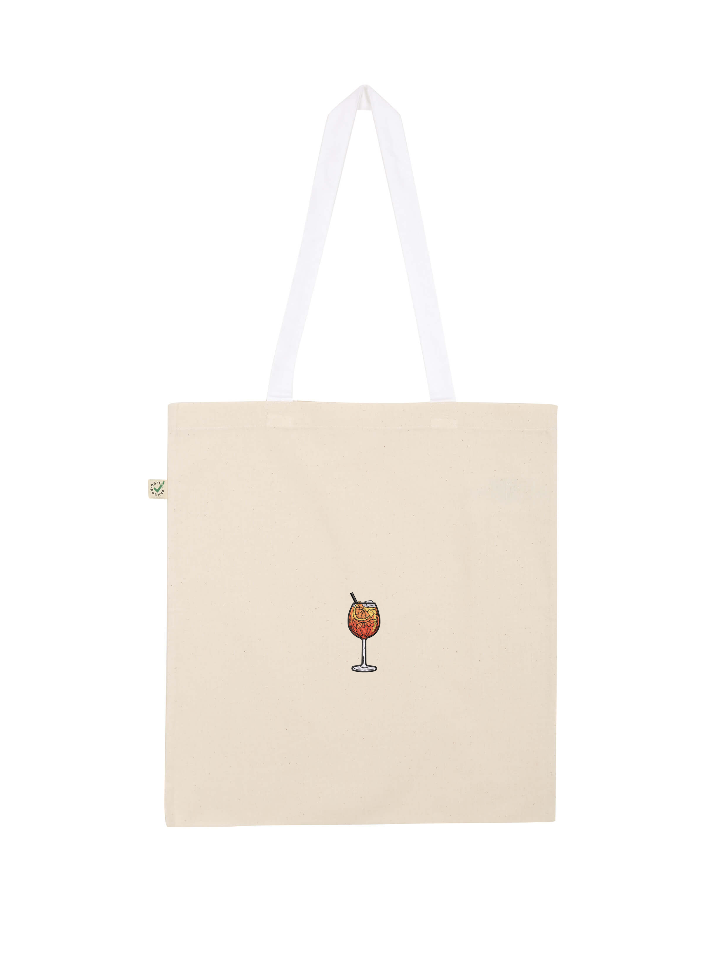 Bestickte, fair produzierte Bio-Baumwoll-Tragetasche im Spritz Design.